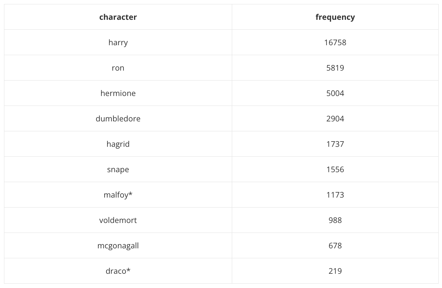 By far, Harry is the most frequently named character in the book series, with 16,758 mentions. That he was most frequently referenced wasn’t a surprise. That he was nearly triple the next most frequently named character, Ron, was for me.