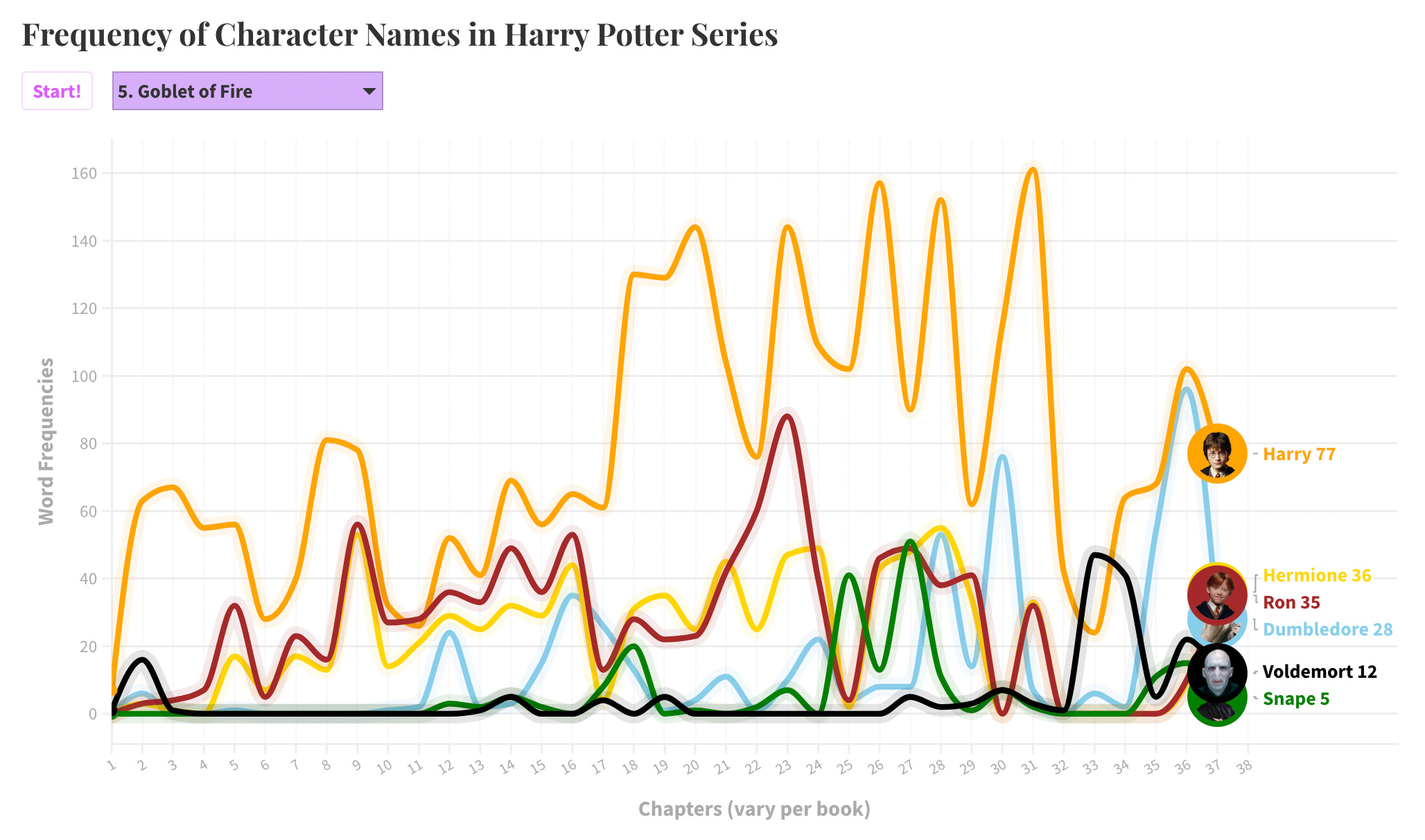 So I took just six character names from the list–Harry, Ron, Hermione, Dumbledore, Snape, and Voldemort–and created an animated visualization that can be filtered per book. It offered a unique way to see new patterns in the text, one that any HP fan can quickly enjoy.