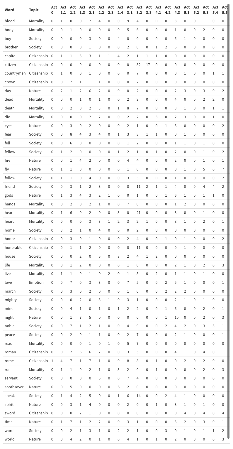 The resulting list of Top 50 words included few surprising key words: blood, body, boy, brother, capitol, citizen, countrymen, crown, day, dead, death, die, eyes, fear, fell, fellow, fire, fly, follow, friend, gods, hands, hear, heart, home, honor, honorable, house, life, live, love, march, mighty, mine, night, noble, peace, read, roman, rome, run, servant, soothsayer, speak, spirit, sword, time, word, world, wrong.