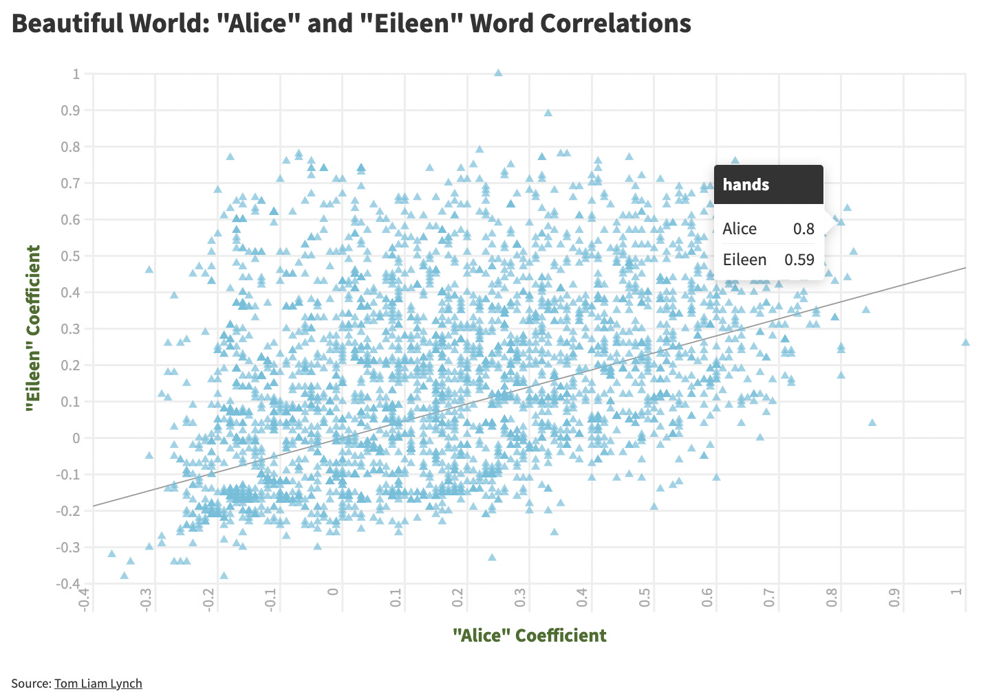To explore for your self, simply click on this interactive version and roll over the triangles on the chart where you will see one correlation coefficient for each character. That number refers to how statistically strong the word relates to Alice and/or Eileen. A week correlation is -1, 0 is neutral, and 1 is very strong.
