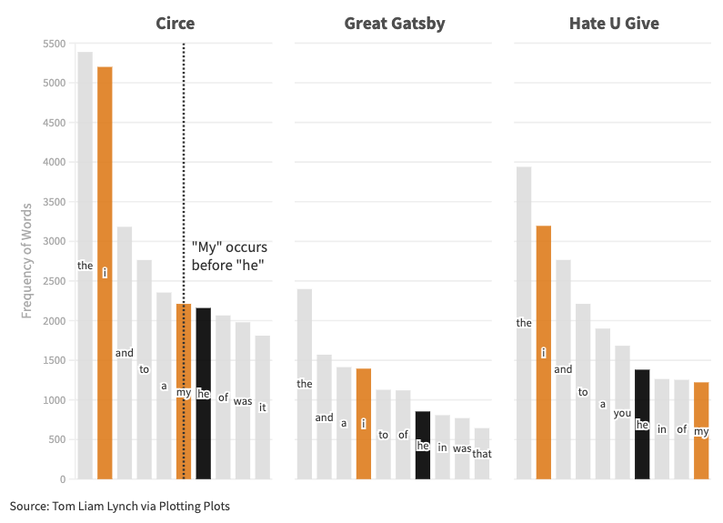 Literary data further colors my enjoyment of the text, particularly when it comes to pronouns. The word I is the second most frequently used word in the book with an even 5,200 uses. Such use aligns with other first-person books I have explored. Both The Great Gatsby (1,394) and The Hate U Give (3,195), for instance, feature the word I in the top five list of the books’ most used words.