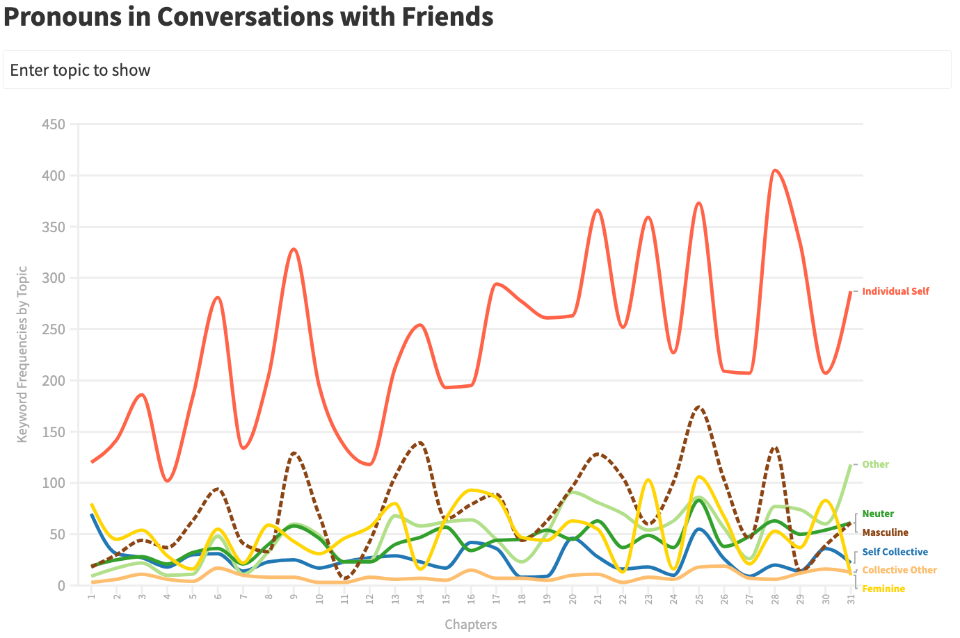 Each data point refers to the total number of times words associated with the topic were used in the novel. After exploring the data a bit, I found the most interesting data to relate to Individual, Feminine, and Masculine pronoun topics. Here’s what I saw.