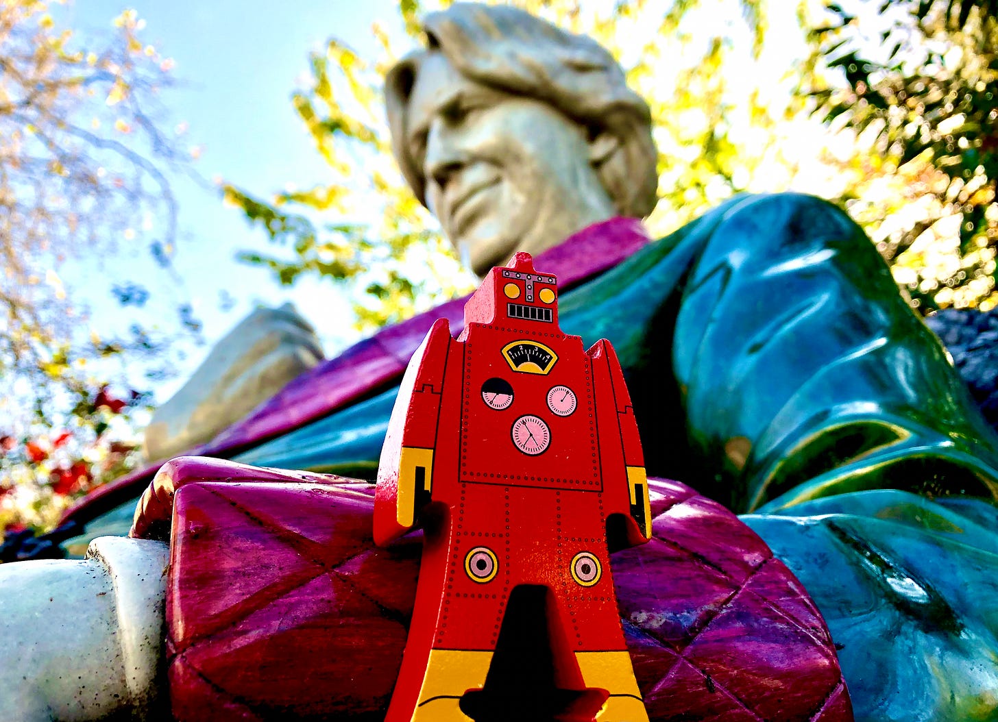 I love Dublin, and spent the morning before my interview taking pictures of a little wooden robot posing in different locations around the city, some literary and some just lovely. (My favorite is the one above, with a statue of Oscar Wilde in Merrion Square.)