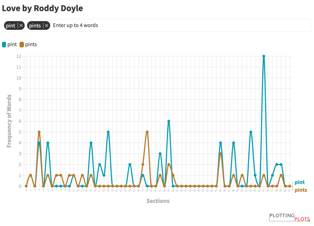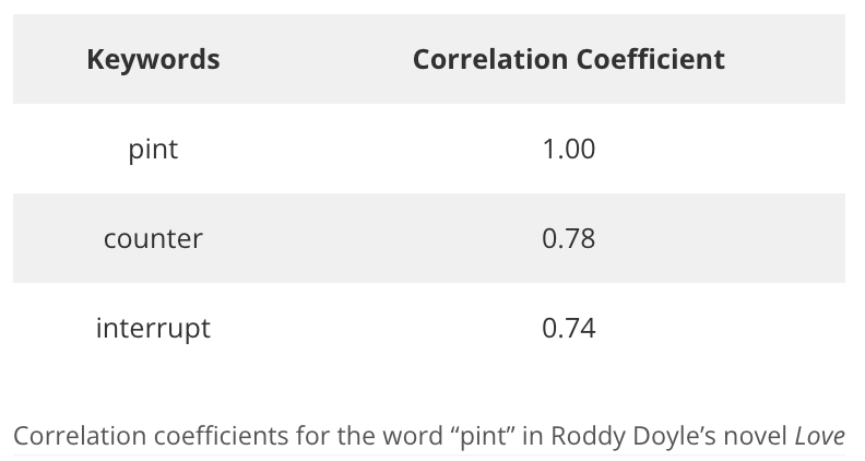 For Doyle’s book Love, I created a spreadsheet with the frequency of use for every word in the book. Since the book doesn’t have chapters, I used the section breaks (indicated with “***”) to identify the book’s structure. Then, I reviewed words associated with drinking to see which ones had the both high frequency of use and appeared throughout the book. Finally, using a common correlation coefficient formula, I compared the use of pint in the text to all 4,794 other unique words.