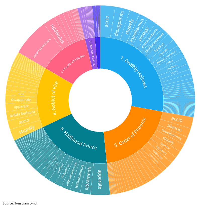 I then pulled the data for those spells, filtered by each book. The result? This data wheel that lets you explore each book’s top spells and see exactly how many times the spells were used. Take the fully interactive wheel for a spin for yourself right here!