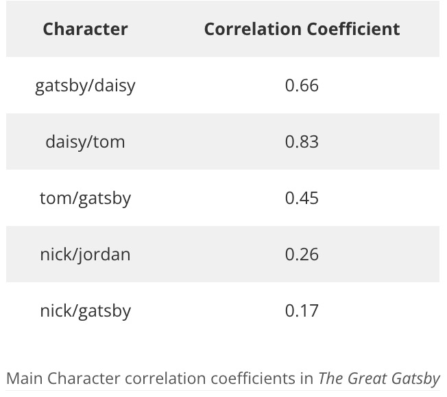 In order to gain greater insight, I analyzed the literary data for the two books. Each dataset contained the frequency with which every word in the book was used per chapter. Then, I used a common formula to determine the correlation coefficient for key characters’ names. A correlation coefficient provides a kind of score for the way data points relate to each other. When Fitzgerald writes Gatsby’s name, for instance, how often is the name Daisy also used? Are they always used similarly together, or do they diverge? The scores range from -1 (indicating very weak correlation) to 1 (indicating very strong correlation). And a 0 indicates a neutral relationship.