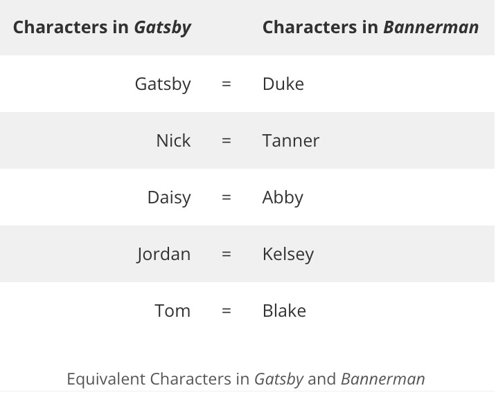 The characters in the two books line up pretty neatly. In F. Scott Fitzgerald’s novel, Gatsby befriends Nick (who crushes hard on Jordan) so he can get close to Nick’s cousin Daisy who happens to be married to Tom. In Nelson’s novel, the Duke befriends Tanner (who crushes hard on Kelsey) so he can get close to Tanner’s cousin Abby who happens to be dating Blake.
