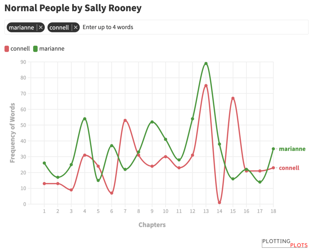 After reading the book, I wanted to explore the relationship between the two lovers further. Using quantitative literary data, I created a visualization of the names “Marianne” and “Connell” throughout the story. Here’s what I saw.